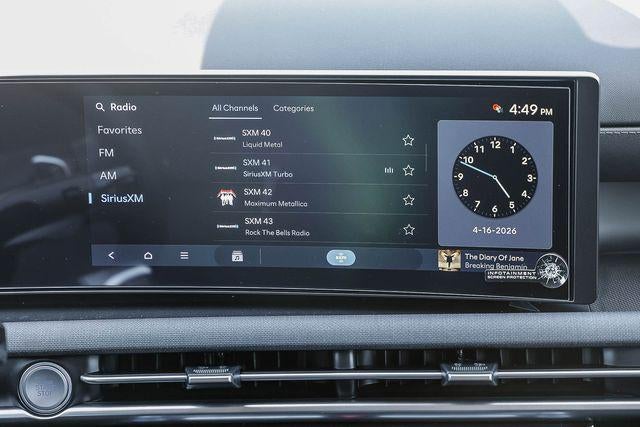 - Radio: AM/FM/HD Audio System -inc: 12.3" color touchscreen display, 6 speakers, SiriusXM satellite radio system (3-month trial subscription), wireless Apple CarPlay and Android Auto integration, controller OTA update capability, Blue Link connected car system and USB connectivity