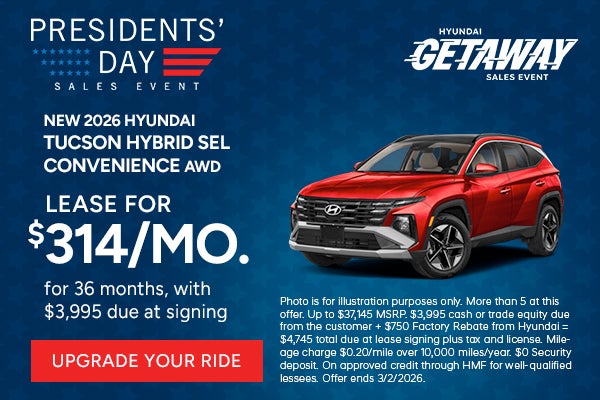 More than 5 at this offer. Up to $37,145 MSRP. $3,995 cash or trade equity due from the customer + $750 Factory Rebate from Hyundai = $4,745 total due at lease signing plus tax and license. Mileage charge $0.20/mile over 10,000 miles/year. $0 Security deposit. On approved credit through HMF for well-qualified lessees. Offer ends 3/2/2026.